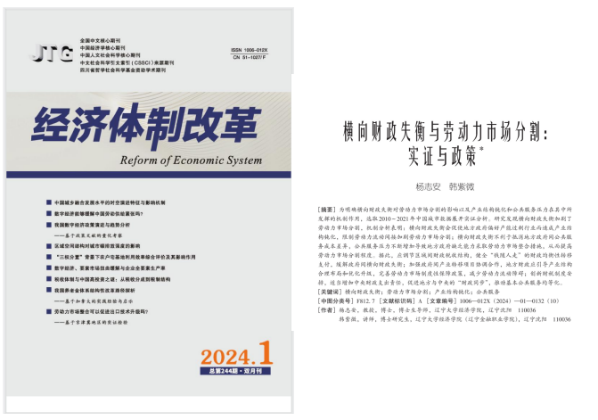 近日,suncitygroup太阳新城suncity太阳新城杨志安教授与其指导的博士生韩紫微合作撰写的论文“横向财政失衡与劳动力市场分割:实证与政策”在《经济体制改革》2024年第1期发表。